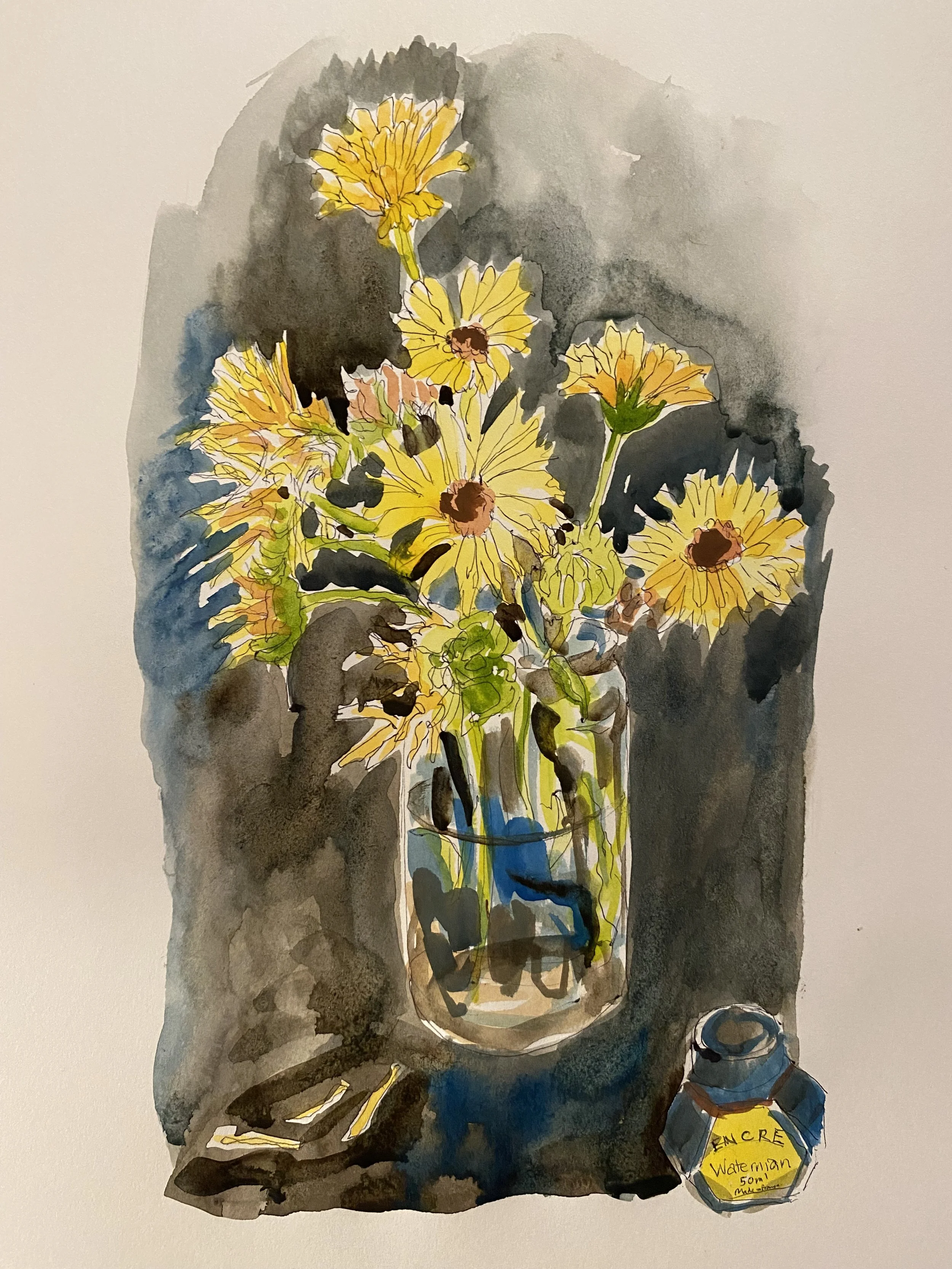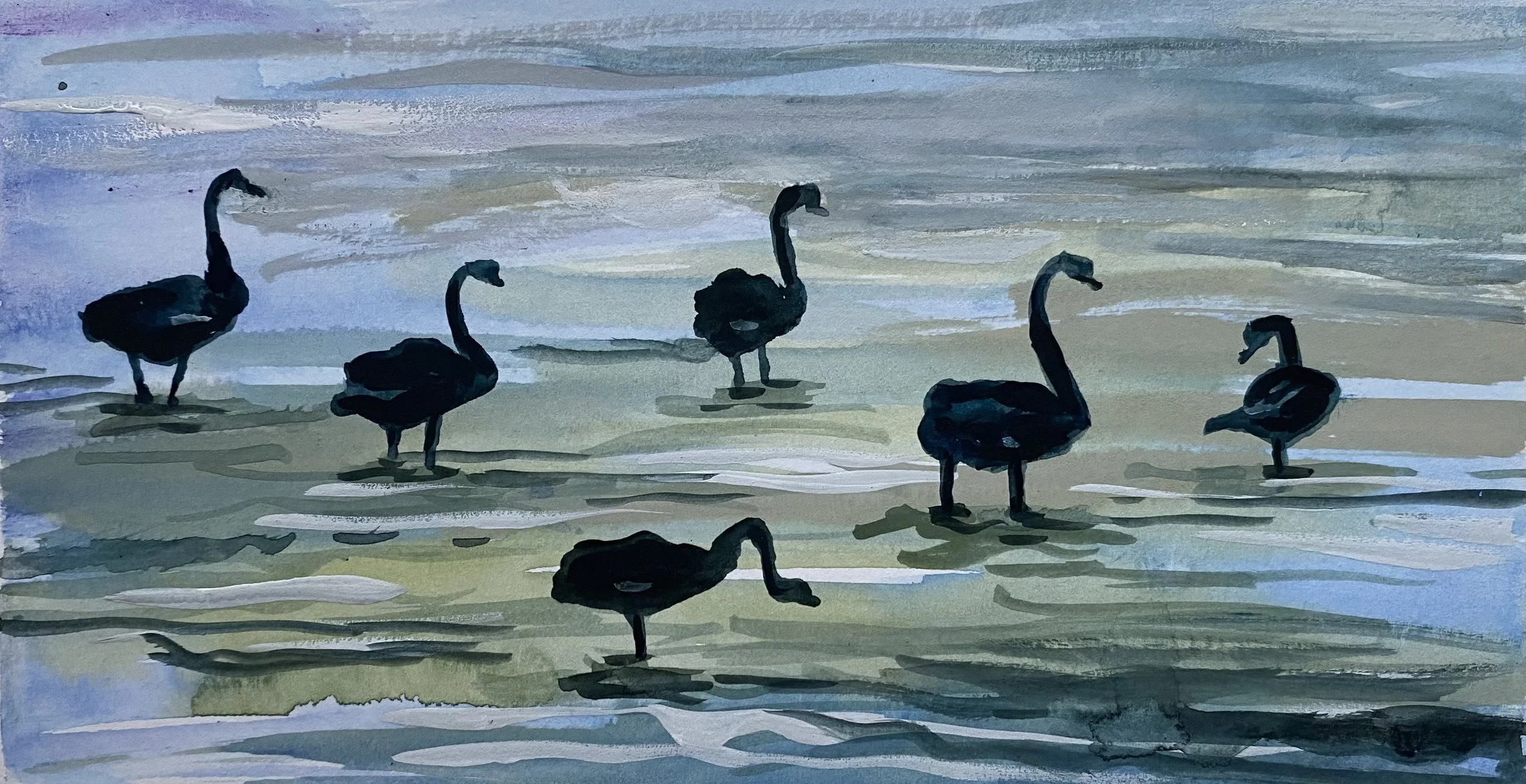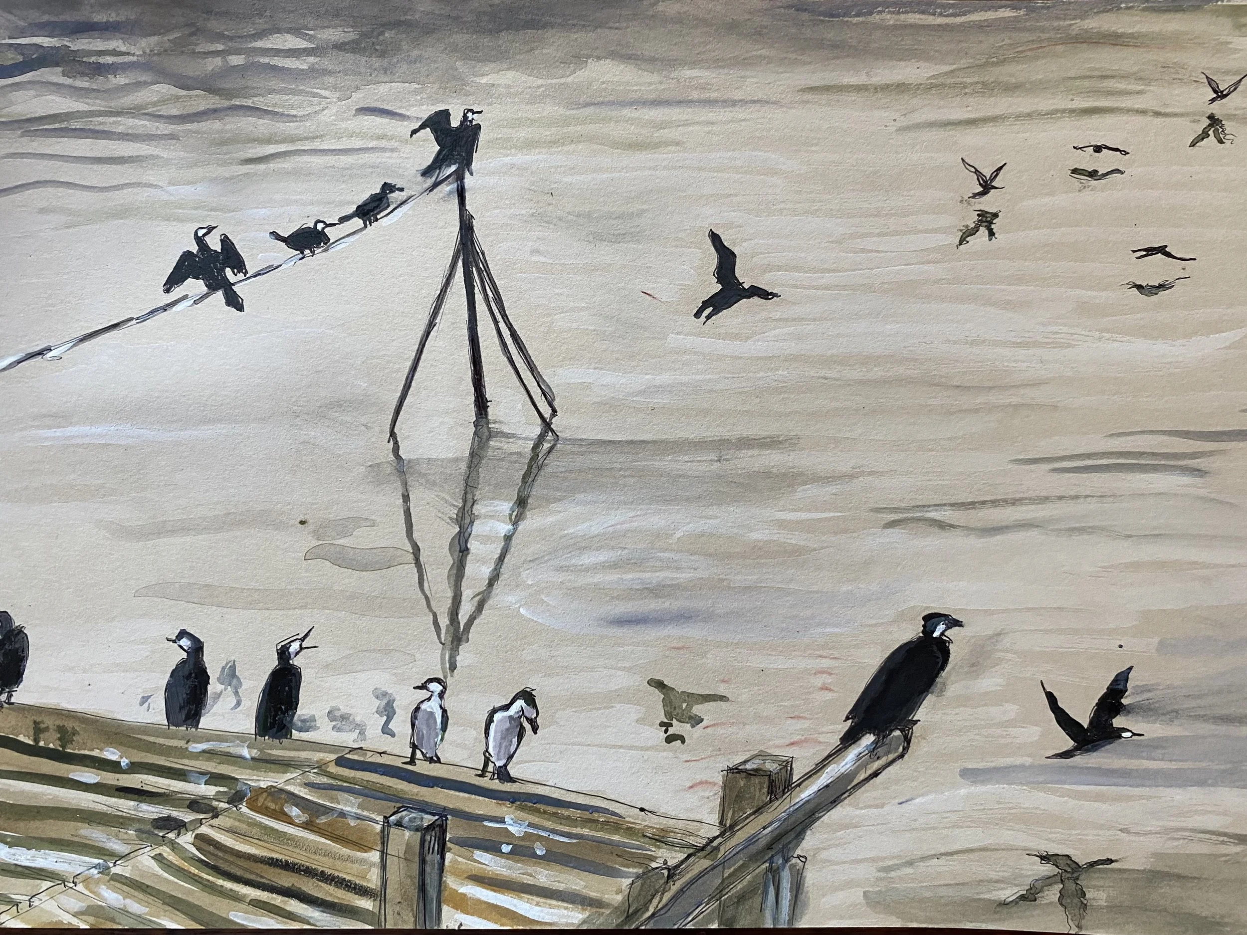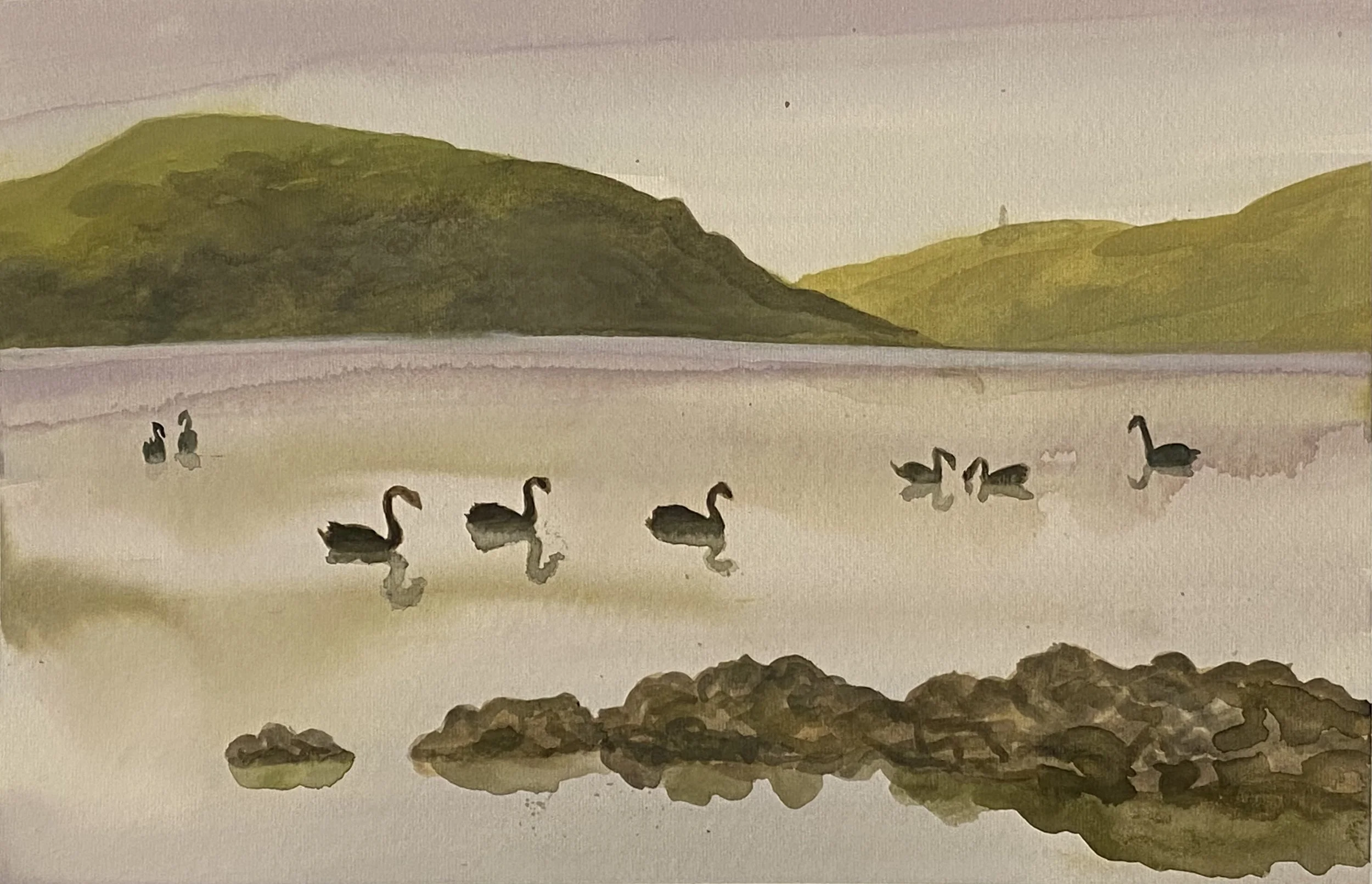"Heading home" Liz Abbott 2024 Pen and watercolour on acid free paper 185 x 132mm