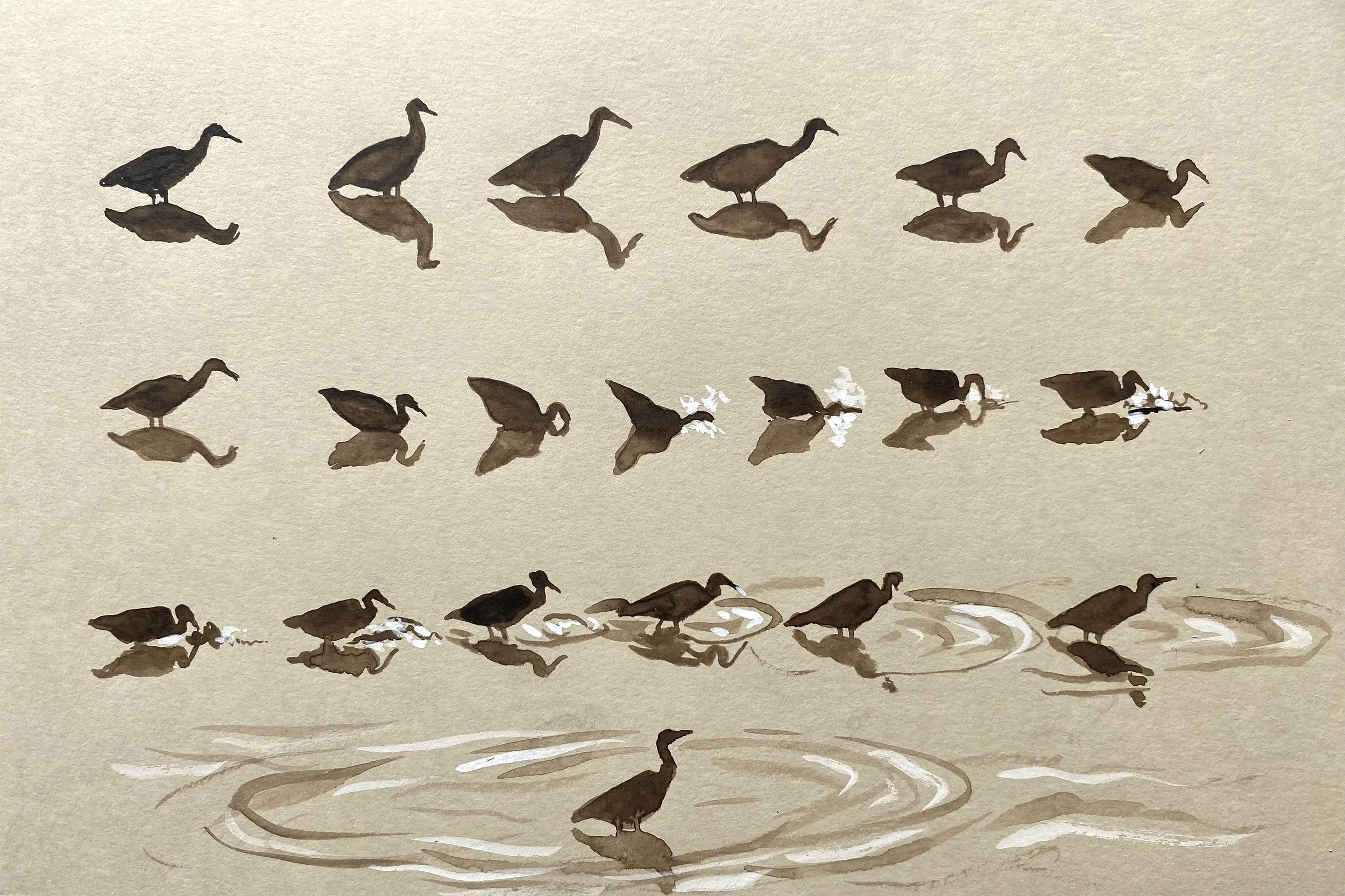"Hop, skip and a jump" Liz Abbott 2024 Pen and watercolour on acid free paper